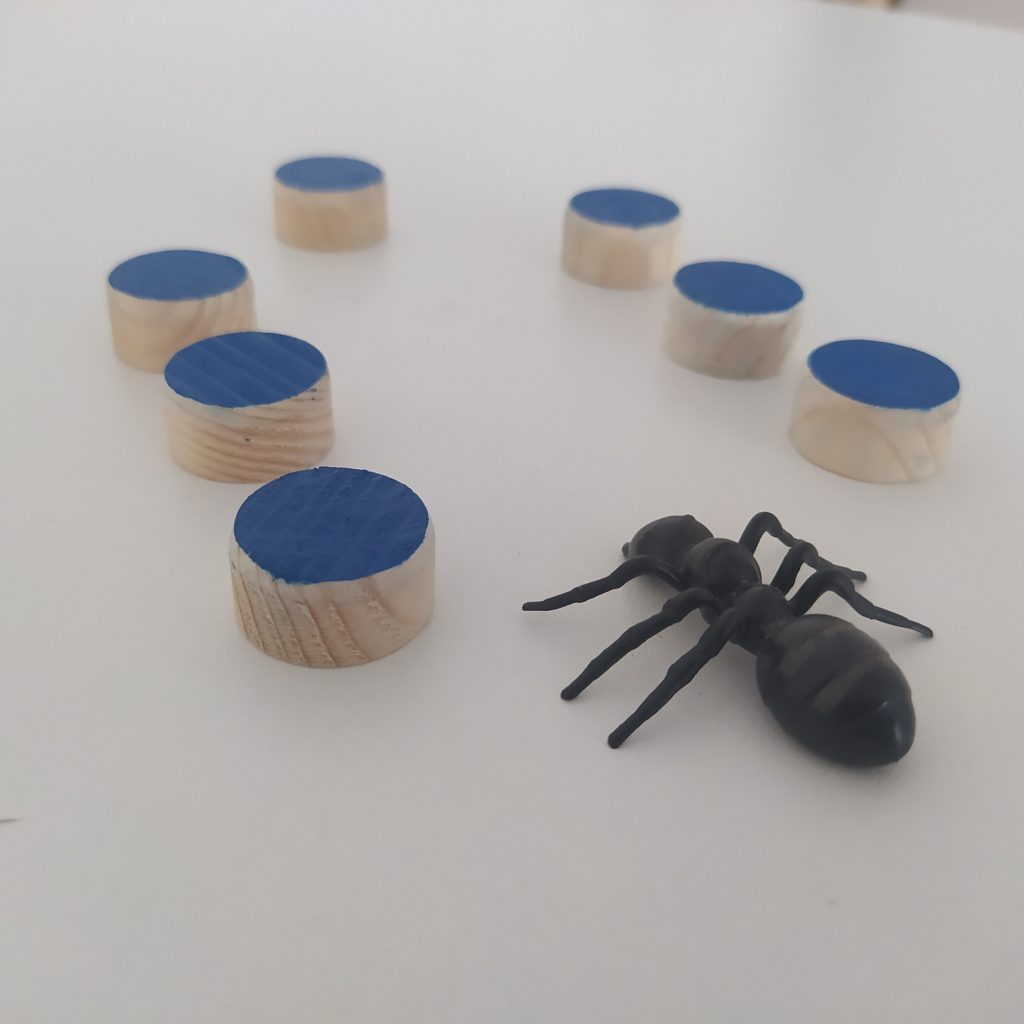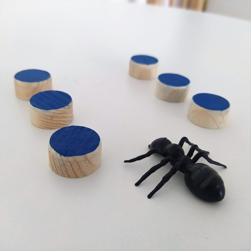 Die Klötzchen können auch anderweitig eingesetzt werden. Die folgenden Bilder zeigen beispielsweise, wie sich überprüfen lässt, ob eine Zahl gerade oder ungerade ist: Kann die Ameise ohne Hindernis hindurch krabbeln, ist die Zahl (hier 6) gerade, versperrt ein Klötzchen ihren Weg, ist die Zahl (hier 7) ungerade.