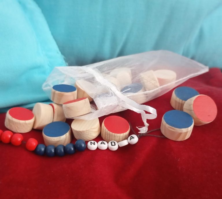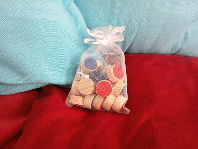 Das Einschulungs-Beutelchen enthält 20 Holzklötzchen zur Visualisierung des Zahlenraums bis 20 und zur Hilfestellung für das erste Rechnen. Die Klötzchen sind handbemalt und haben einen Durchmesser von 2,5 cm. Außerdem enthält das Beutelchen aus Organza eine zweifarbige Rechenkette aus Holzperlen. Auf Wunsch wird diese mit Buchstabenperlen aus holz personalisiert.